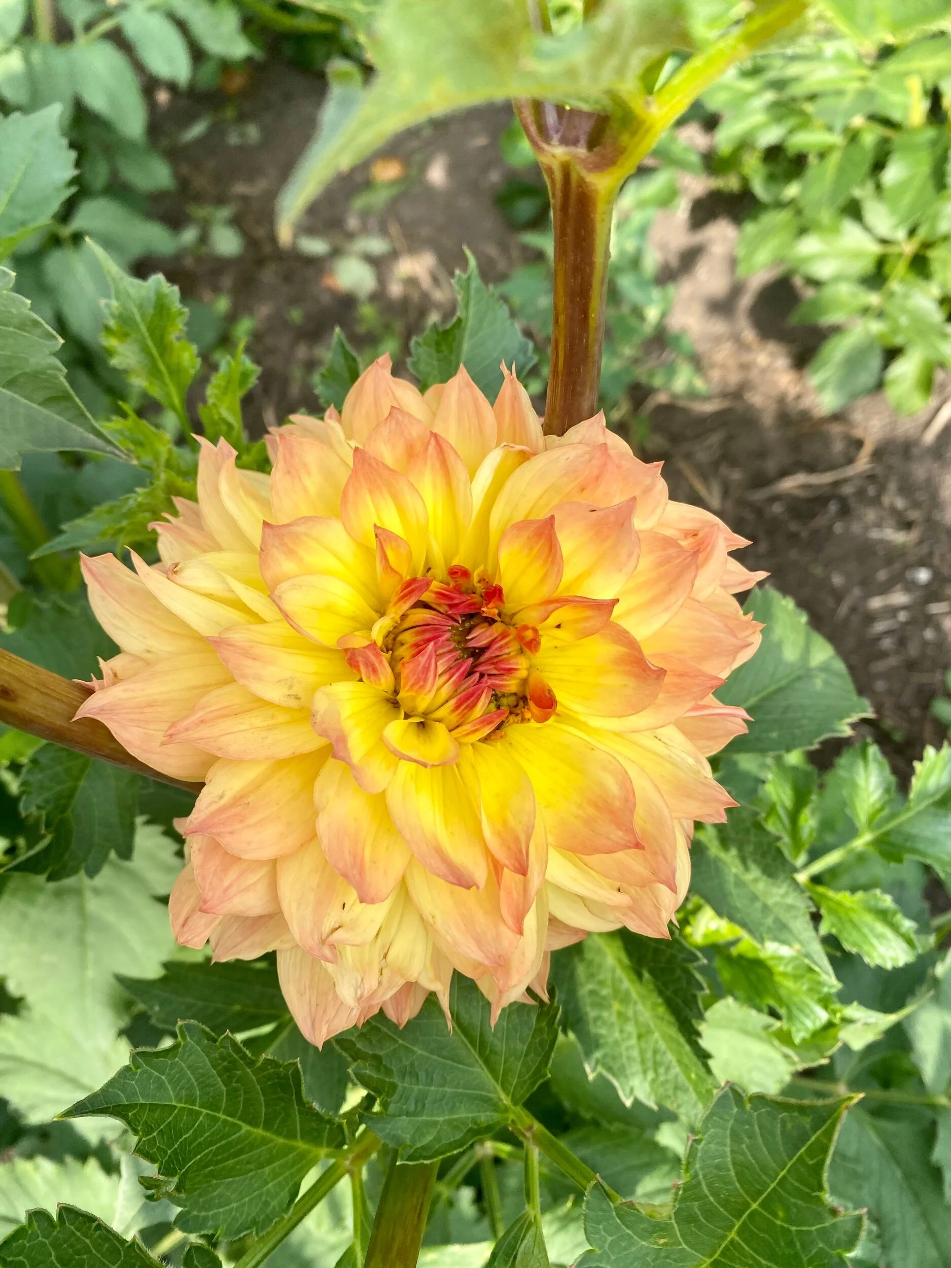 This is a decorative dahlia who’s colour can be affected by temperature and sunlight hours, sometimes its a more vibrant yellow with coral tips and then throughout the season fades to a cream with peach tips.